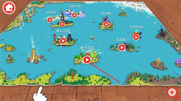 1、在地图上找到【兔子花园】,点击它对应的红色播放按钮,就能进入该区域的互动环节。