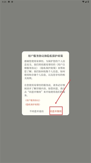 1、阅读【用户服务协议和隐私保护政策-弹窗】后,点击【同意并继续-按钮】进入应用。