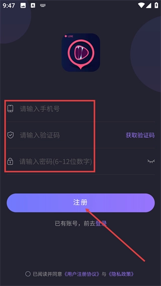 2、进入注册页面后,按顺序填写【请输入号】【请输入验证码】【请输入密码(6~12位数字)】,完成信息填写后点击【注册】按钮。