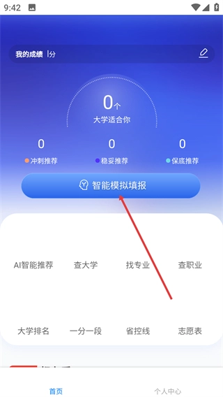 1、界面呈现【我的成绩】以及适配大学的数量,能借助【智能模拟填报】功能启动志愿推荐,也可以运用【AI智能推荐】-【查大学】等辅助工具。