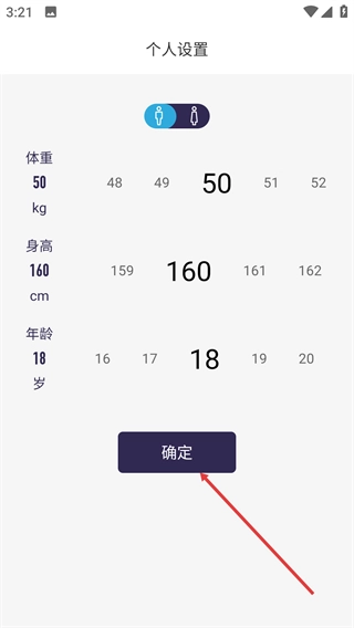 1、在个人设置页面选择性别,调整体重、身高、年龄等参数后点击【确定】按钮,即可完成个人信息的配置,为训练数据提供基础依据。