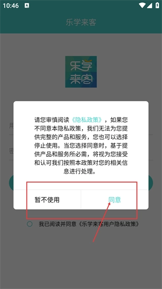 1、在弹窗里阅读《隐私政策》,要是认可其中的信息处理规则,点击“同意”按钮,就能接着使用【乐学来客】的产品和服务。