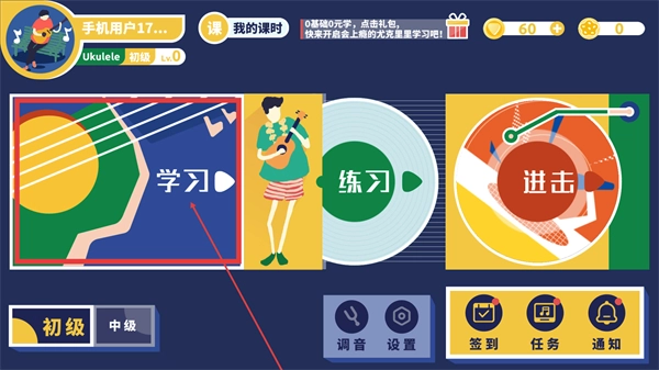 1、在乐器选择页面,点击【尤克里里】选项,即可进入对应的乐器学习课程界面。