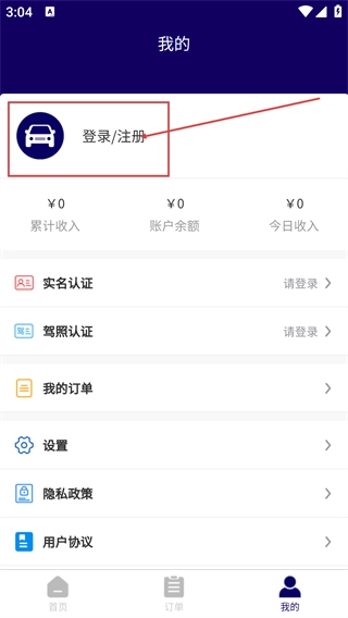 2、进入“我的”页面后,点击【登录/注册】按钮;此页面同时设有实名认证、驾照认证等功能模块,旨在帮助用户完善使用服务时所需的个人资质信息。