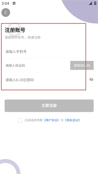 4、在账号注册页面,按顺序填写【请输入号】,点击【获取验证码】并填入相应内容,设置好密码后,点击【立即注册】即可完成注册。