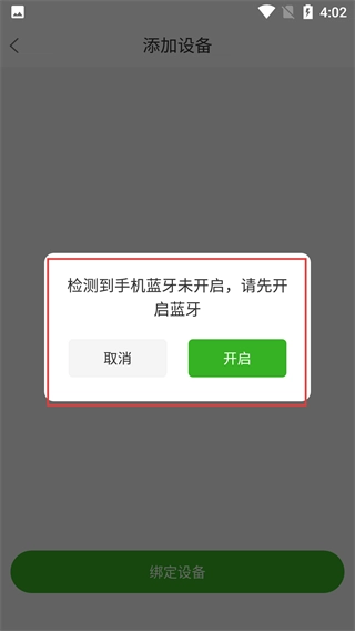 4、执行添加设备操作时,若出现【检测到蓝牙未开启-请先开启蓝牙】的提示,可点击【开启】按钮来打开蓝牙,从而顺利推进设备绑定流程。