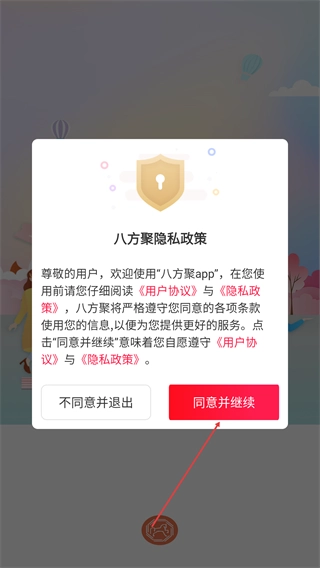 1、仔细阅读【用户协议】和【隐私政策】的内容,确认无误后点击【同意并继续】按钮,即可进入“八方聚”的后续操作流程。