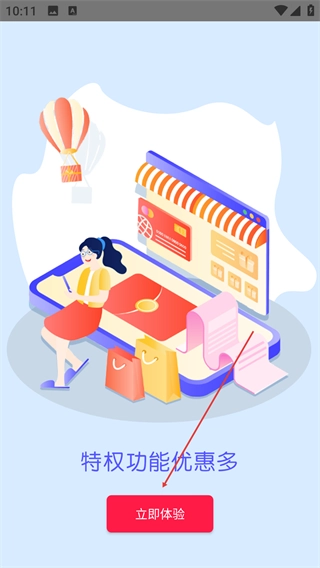 2、在应用引导页面,点击【立即体验】按钮,即可进入应用主界面,进而使用其特权功能与优惠服务。