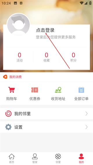 2、在【我的】页面找到并点击【点击登录】选项,进入账号登录界面,这样就能解锁更多服务。