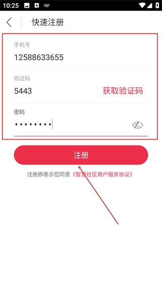 4、在快速注册页面填写号码、获取并输入验证码、设置密码后,点击【注册】按钮即可完成账号创建。
