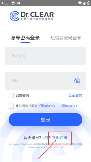 1、打开可丽尔博士病例管理系统的登录页面,点击“立即注册”按钮,即可启动注册流程。