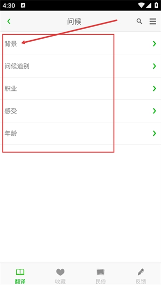 2、进入“问候”分类的子分类页面后,能选择“背景”“问候道别”等细分内容类型,从而更精准地筛选出所需翻译的内容方向。