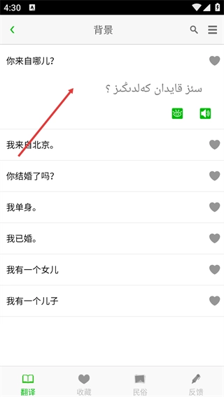 3、进入“背景”子分类页面,就能查看该类别下的具体交流语句,像“你来自哪儿?”“我来自北京。”这类内容都能看到。