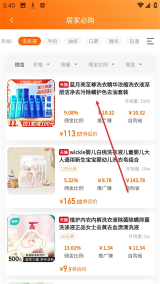 3、在居家必购分类下,找到目标热销品类(例如洗衣液),点击其右侧的“大家都在买”选项,即可进入该品类的商品列表页面。