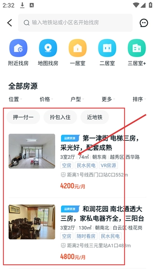 1、在找房首页的功能栏里,点击【租房】选项,就能进入租房房源的筛选与列表页面,查看各类出租房源的相关信息。