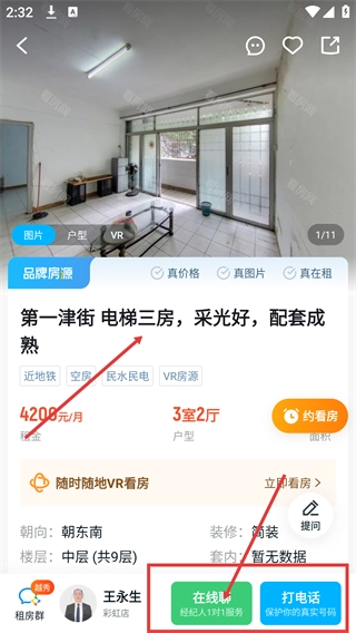 3、在房源详情页面,点击【在线聊】按钮,即可进入与该房源对应的经纪人王永生的聊天界面,进而发起咨询沟通。