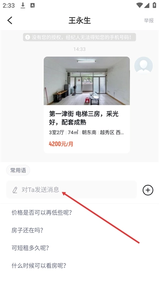 4、在聊天界面的【对Ta发送消息】输入框里,填写咨询内容(像价格、房源状态、看房时间这类信息),就能给经纪人发送沟通信息。