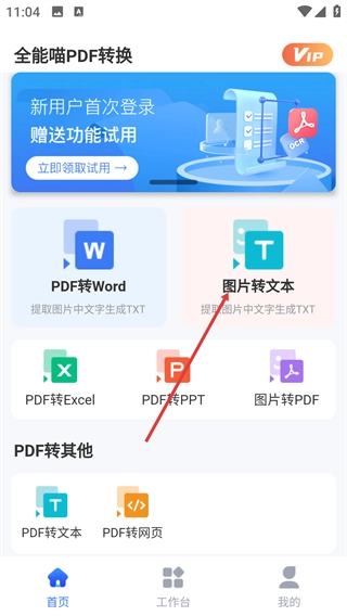 1、进入此界面后,找到【图片转文本】功能选项,该功能能够提取图片里的文字并生成TXT文件,点击该选项即可进入图片处理流程。