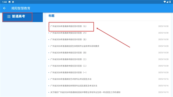 2、在招生资讯页面的“普通高考”分类中,挑选目标资讯(例如“广东省2026年普通高考报名百问百答(七)”),点击进入详情页面。
