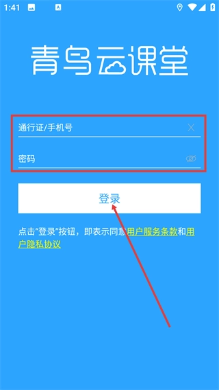 1、在【青鸟云课堂】的登录界面,按顺序输入【通行证/号】和【密码】,点击【登录】按钮就能进入系统。