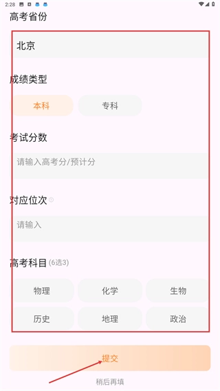 1、请按顺序填写高考省份、成绩类型、考试分数等相关信息,选好对应的高考科目后,点击【提交】按钮,即可完成信息录入操作。