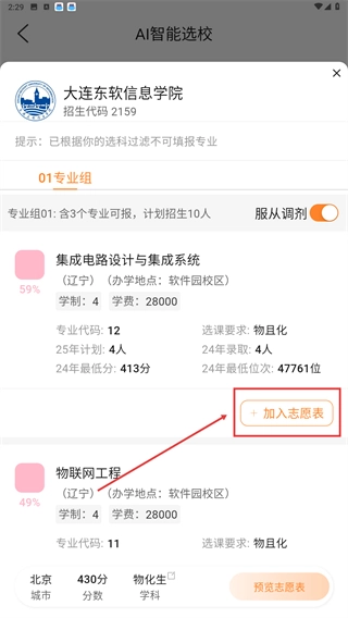 4、查看专业详情后,点击【加入志愿表】按钮,即可把该专业添加到个人志愿填报清单里。