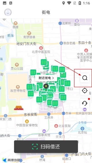 1、进入【街电】页面后,可借助地图查看周边设备,点击【附近街电】选项或搜索图标能查看具体点位,页面底部设有【扫码借还】功能。