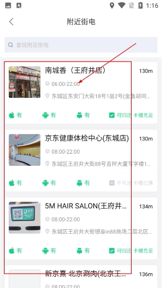 2、进入【附近街电】列表页面后,能够查看像【南城香(王府井店)】这类商家的距离、营业时间等信息,同时也可以识别出设备充足的商家。