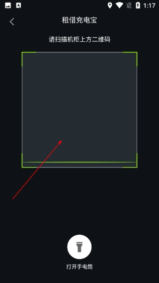 4、进入【租借充电宝】页面,需扫描机柜上方的二维码来完成操作,若扫码识别困难,可点击【打开手电筒】功能辅助扫码,以提升识别效率。