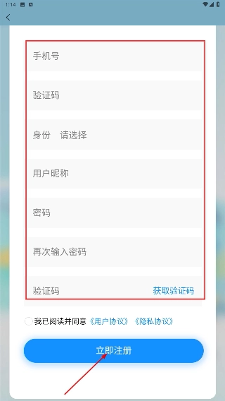 4、若选择注册,需依次填写【号】【验证码】【身份】等信息,设置密码,获取验证码后勾选相关协议,点击【立即注册】按钮即可完成账号创建。