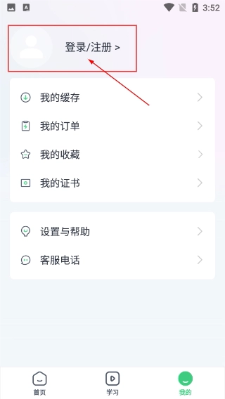 2、进入【我的】页面后,点击顶部的【登录/注册】按钮,完成操作后即可使用【我的缓存】【我的订单】等个人相关功能。