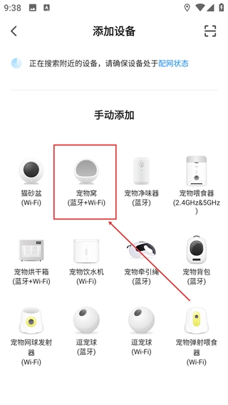 2、进入【添加设备】页面后,挑选相应的设备类型(例如【宠物窝-(蓝牙+Wi-Fi)】),并且要保证设备处于可配网的状态。