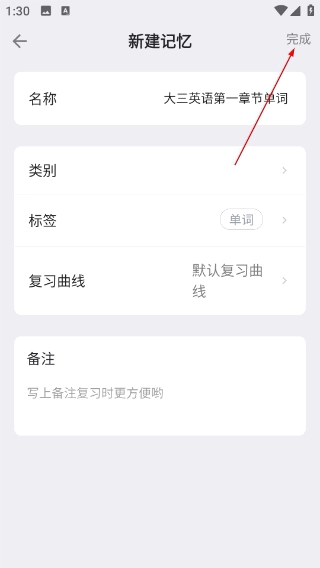 3、进入【新建记忆】页面,在填写好【名称】等相关信息后,点击页面右上角的【完成】按钮,就能保存刚创建的记忆内容了。
