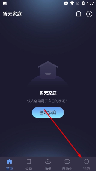 1、进入应用首页后,要是页面显示【暂无家庭】,既可以点击【创建家庭】功能按钮,也能通过点击底部的【我的】选项进入个人页面。