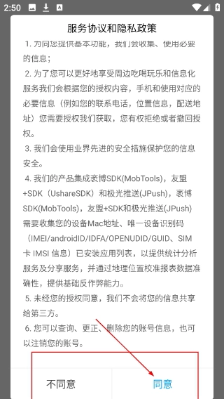 1、仔细阅读【服务协议和隐私政策】里关于信息授权、安全保护等方面的内容,然后点击页面底部的【同意】按钮,完成协议确认,这样就能继续使用软件功能了。