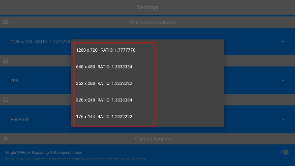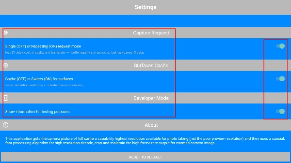 4、在“Settings”页面,能够对【CaptureRequest】【SurfacesCache】等功能选项进行开启或关闭的设置,以此来调整应用的相关参数。