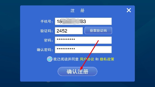 3、进入注册页面后,依次填写【号码】、输入【验证码】并设置好密码,随后点击对应的注册按钮,就能完成账号的注册流程。