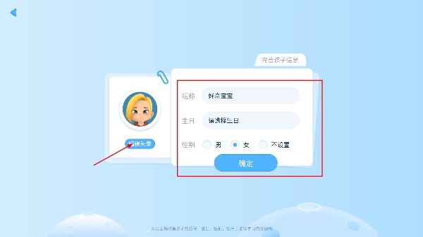 1、进入个人信息编辑界面,把昵称、生日填写好,再选定性别,之后点击“确定”按钮,就能完成信息的配置了。