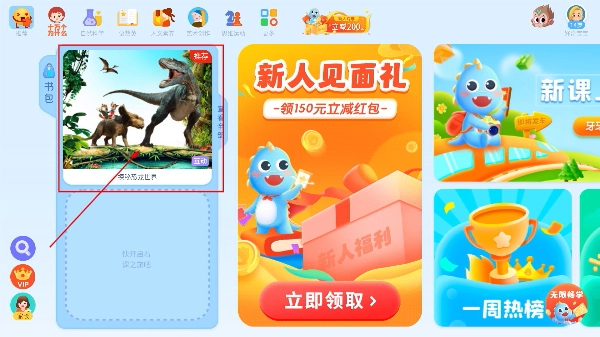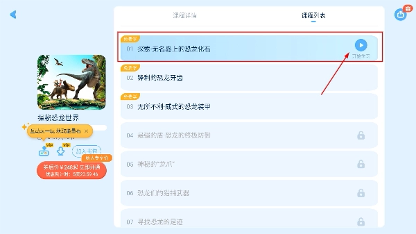 2、在首页挑选目标课程的封面(例如恐龙主题),点击进入该课程对应的内容页面。