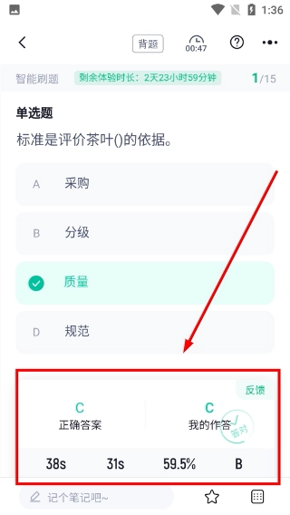 4、切换至背题模式后,在选定正确选项(例如本题选择“质量”)时,页面底部会呈现出正确答案、答题耗时等相关数据,以此来帮助用户了解自身的答题状况。
