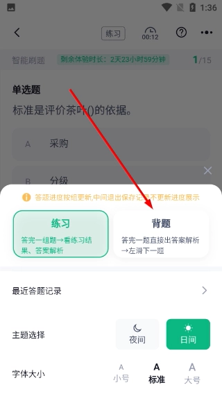 3、答题时,点击顶部的“练习”按钮可以切换模式,选择“背题”模式后,答题过程中会直接展示答案解析,这样能帮助大家更快地记住知识点。