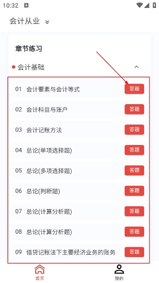 2、进入【章节练习】里的【会计基础】板块,挑选对应的章节内容,点击右侧的【答题】按钮,就能进入该章节的练习题目页面。