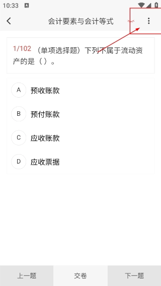 3、进入【会计要素与会计等式】的题目页面后,可点击右上角的按钮查看更多功能,与此同时开始完成这道【单项选择题】的练习题。