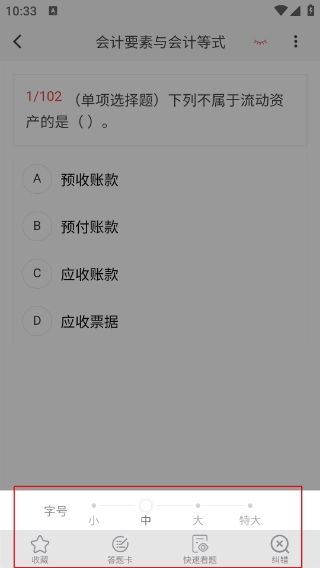 4、在题目页底部,你可以调整【字号】(包含小、中、大、特大这几个选项),同时也能使用【收藏】【护眼模式】等功能,这些功能可以辅助你更舒适地进行答题。