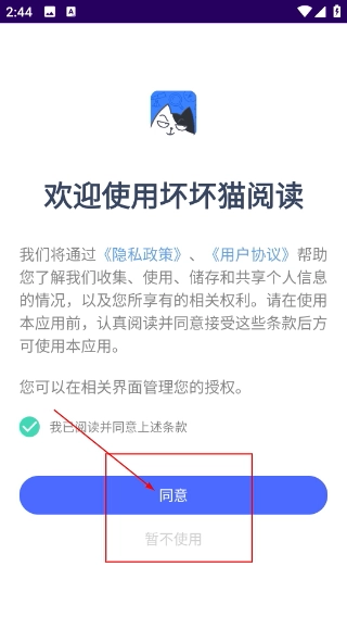 1、进入【坏坏猫阅读】应用时,需先阅读【隐私政策】与【用户协议】,勾选同意相关条款后点击【同意】按钮,即可进入应用使用各项功能。