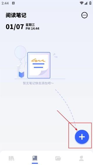 3、进入【阅读笔记】页面,若当前没有任何笔记,点击页面上的【+】按钮,就能开启添加阅读笔记的操作流程。