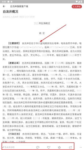 4、进入“自贡井概况”详情页后,既能浏览相关内容信息,也可借助底部的功能按钮开展互动操作(例如点赞、收藏等)。