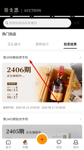 3、进入拍卖结果页面后,找到你想要查看的目标专场(例如第2406期),点击对应的专场卡片,就能进入该拍卖专场的详情页面。