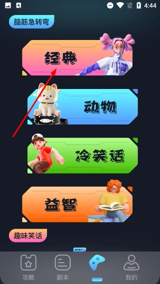 3、在乐园页面找到【经典】分类并点击,进入经典脑筋急转弯的题目列表页面,即可获取该类型的趣味题目。