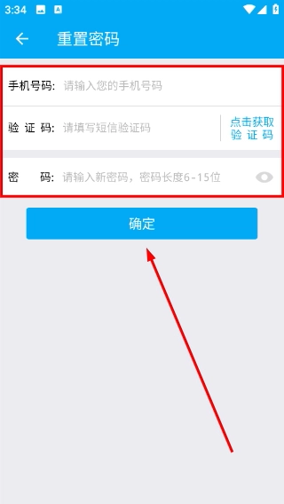 2、进入重置密码页面后,按顺序填写号码、获取并输入验证码、设置新密码,全部完成后点击“确定”按钮,就能完成密码重置。